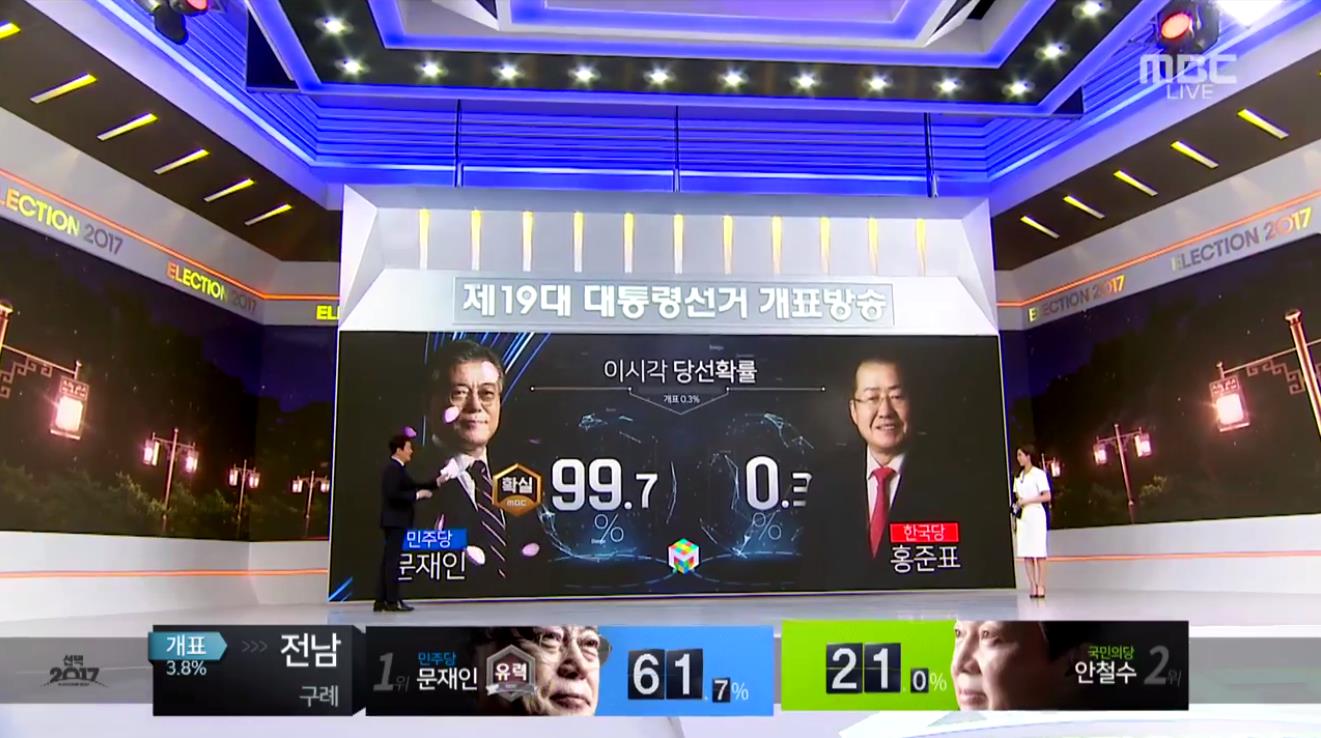 MBC 개표방송 ‘선택 2017-스페셜M’, 이례적일 정도로 빠른 당선예측 보궐 선거로 치러진 19대 대통령 선거, 투표시간이 2시간 늘어나면서 개표도 늦어졌지만, 지능형으로 진화한 MBC(사장 김장겸)의 당선확률 예측시스템 ‘스페셜M’의 예측은 오히려 더 빨라졌다.