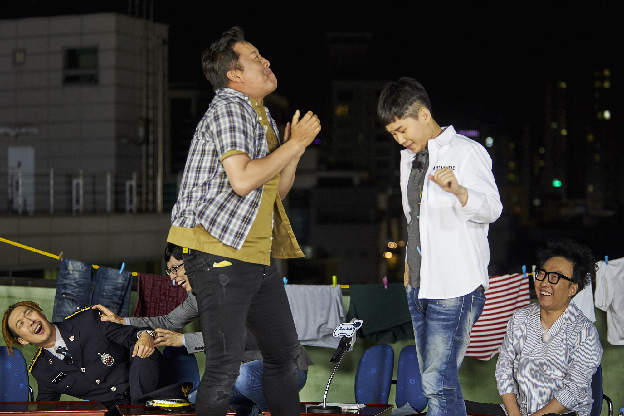 실내 뉴스 스튜디오가 아닌 젊은이들의 거리, 홍대의 한 건물 옥상에서 진행된 ‘무한뉴스’에서는 ‘무한도전’에서 일어나는 크고 작은 소식들을 재치 있게 전달한다.