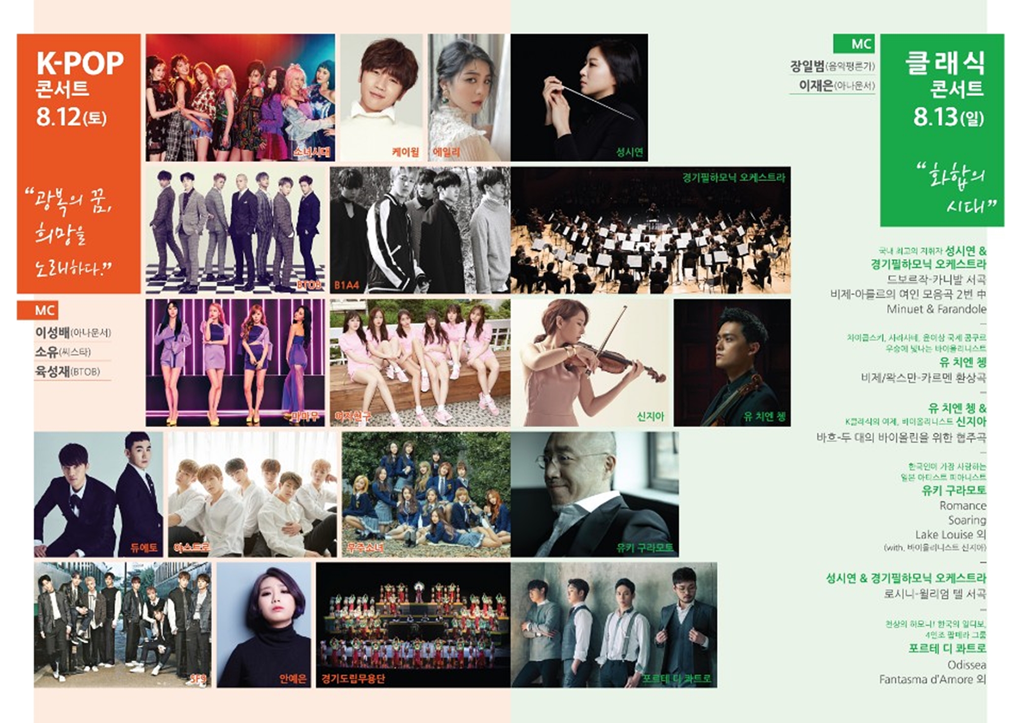이날 공연에는 이성배 아나운서와 소유, 육성재(BTOB)의 사회로 소녀시대와 BTOB, B1A4, 마마무, 여자친구, 케이윌, 에일리, 우주소녀, SF9, 아스트로, 안예은, 듀에토 등 대세 K-POP스타와 최고의 뮤지션들이 참가하며 화려한 라인업을 예고해 기대감을 높이고 있다.