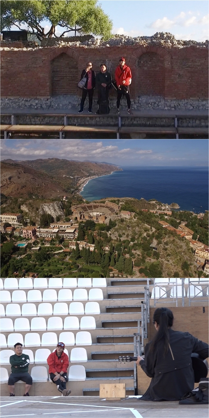 김태원-최민용-윤정수가 시칠리아 모험을 시작한 곳은 시칠리아 중에서도 BC 3세기 경 지어진 고대 그리스 타오르미나 극장. 이른 새벽 고대 극장 한가운데에서 안대를 벗게 된 세 사람은 지중해 바다를 배경으로 한 광활한 풍광은 물론, 오랜 역사를 지닌 고대 유물의 한가운데에서 시공간을 뛰어넘은 듯한 감격에 한동안 말을 잇지 못할 정도였다고 하니 그 풍경에 대한 기대감을 불러일으킨다.