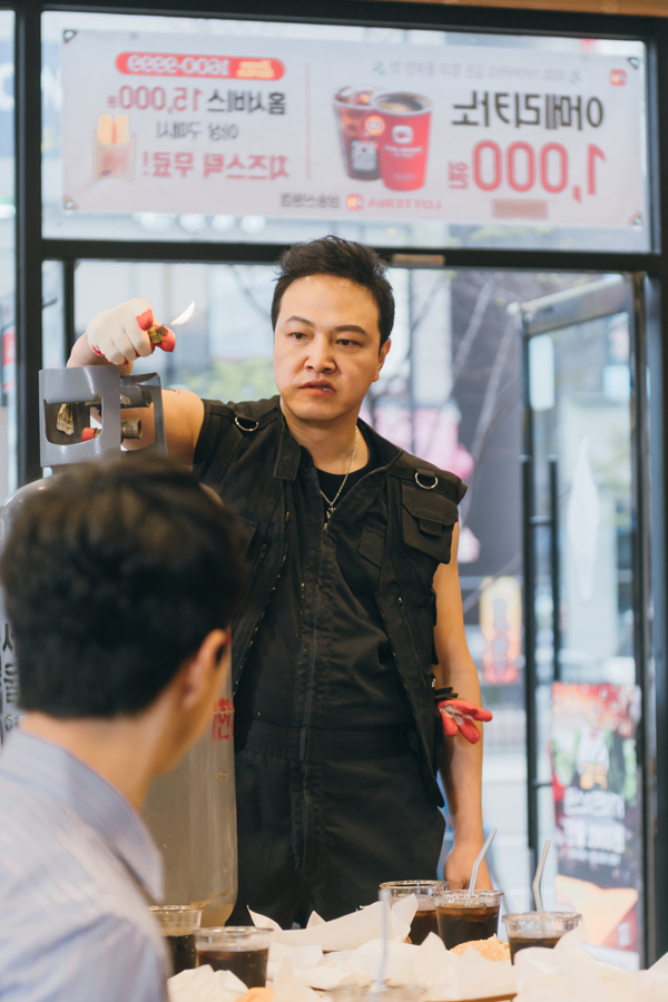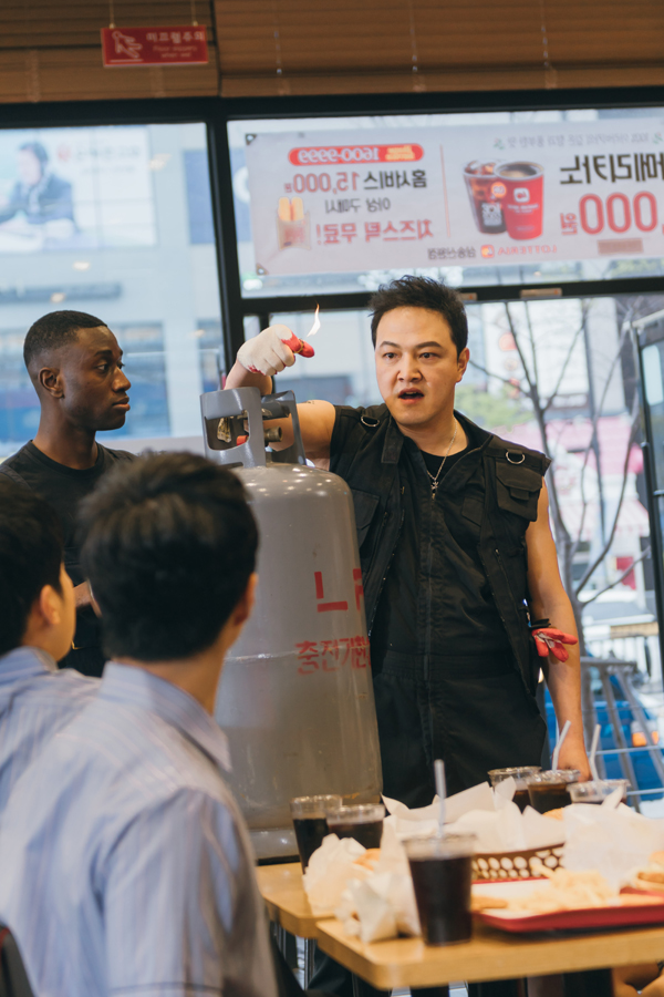 정웅인의 ‘가스통 습격사건’ 장면은 지난달 22일 경기도 일산에서 촬영됐다. 정웅인은 분위기 메이커답게 특유의 호탕한 웃음을 지으며 촬영장에 등장, 현장에 활력을 불어넣었던 터. 특히 정웅인은 촬영에 돌입하자, 번쩍 가스통을 들고, 우적우적 감자튀김을 씹고, 갑자기 소리를 지르는 것까지, 긴장감을 불러일으키면서도, 어딘지 모르게 순박한 면모를 풍겨내는 수철의 모습을 그대로 표현, 현장의 탄성을 자아냈다.