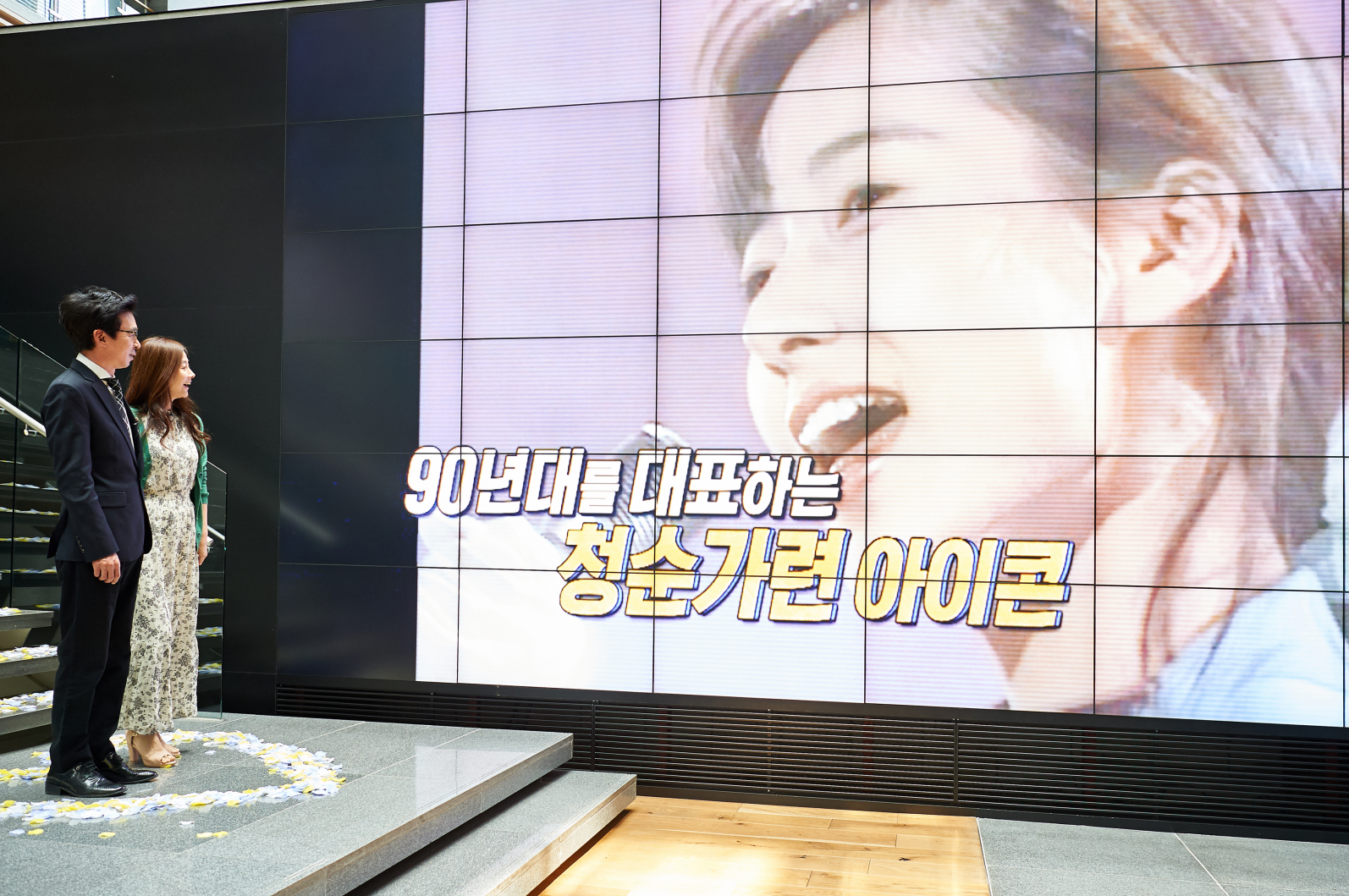 이날 ‘할머니네 똥강아지’ 제작진은 부부로 첫발을 딛는 김국진, 강수지를 위해 아주 특별한 퍼포먼스를 준비했다. MBC 라운지 계단에 꽃잎을 가득 뿌려 로맨틱한 분위기를 만든 가운데, 두 사람이 주인공인 영상을 준비한 것. 90년대 톱스타였던 두 사람은 과거 많은 프로그램에 동반 출연하며 인연을 쌓았지만 연인으로 발전하지는 못했다.