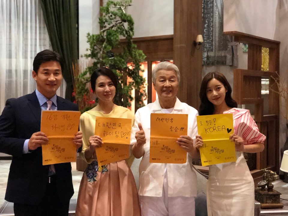 극중 한가족인 오승아, 전노민, 이일화는 들고있던 대본에 싸인펜으로 저마다 ‘대한민국 파이팅’ ‘오 필승 KOREA’ 등을 문구를 쓱쓱 써가며 승리를 기원했다.