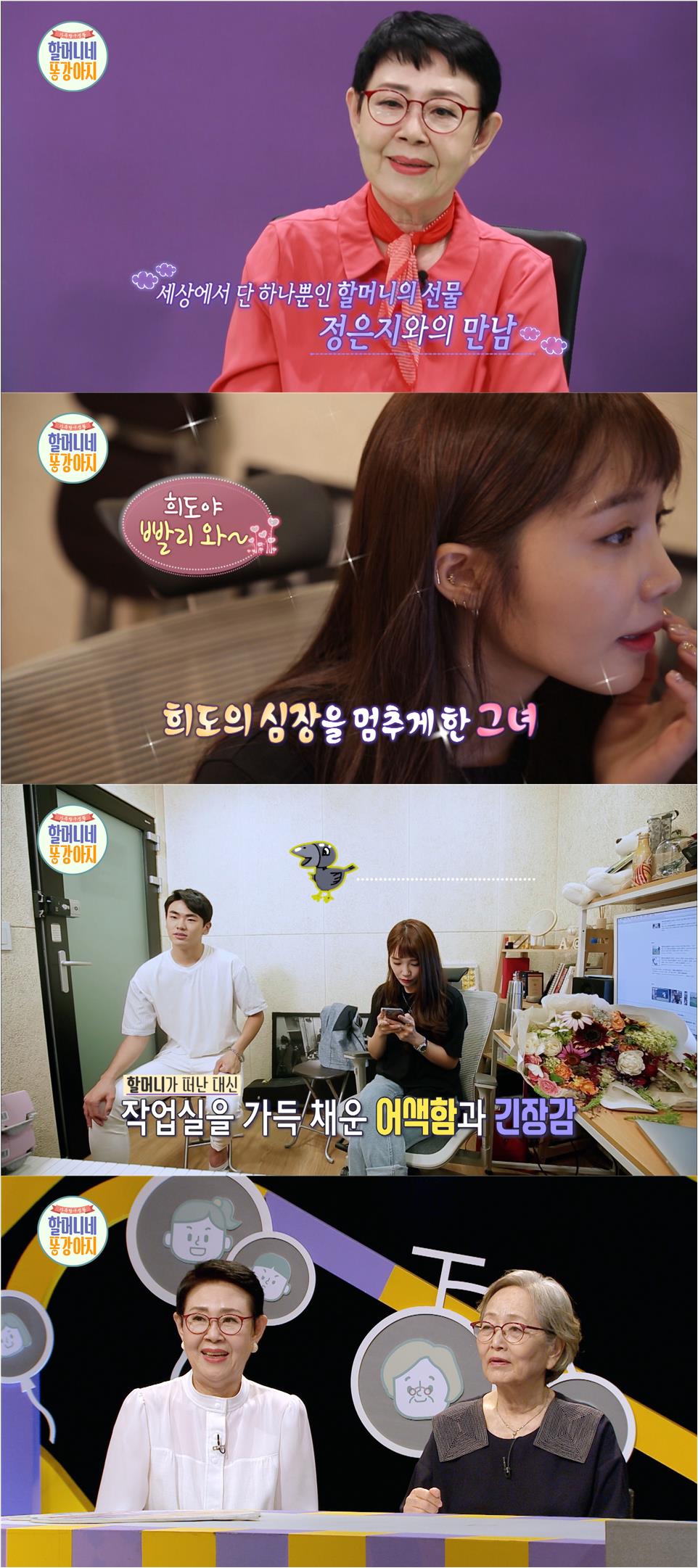 이날 희도는 선망의 대상이었던 정은지로부터 깜짝 선물을 전해 받고, 함께 듀엣 무대를 만드는 등 평생 잊지 못할 생일을 보냈다고 하는 데 특히, 연애경험을 묻는 정은지의 돌발 질문에 뜻밖의 답변으로 할머니는 물론, 스튜디오까지 술렁이게 했다. 긴장감과 핑크빛 웃음이 떠나지 않았던 희도의 특별한 생일파티와 ‘연대장 할마’ 남능미를 당황하게 한 손주의 연애사는 오늘 저녁 ‘할머니네 똥강아지’를 통해 확인할 수 있다.