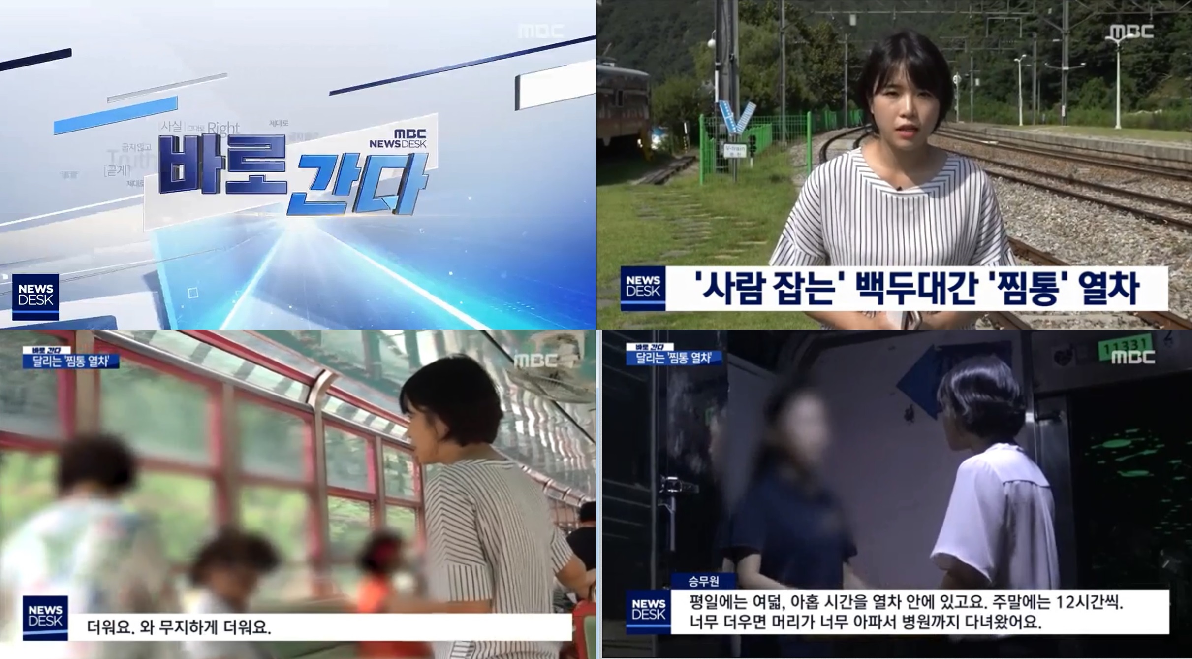 MBC '뉴스데스크'가 '바로 간다' 코너를 통해 에어컨 없이 관광열차를 운행하고 있는 '달리는 찜통 열차'의 황당한 현장을 단독 보도했다.
