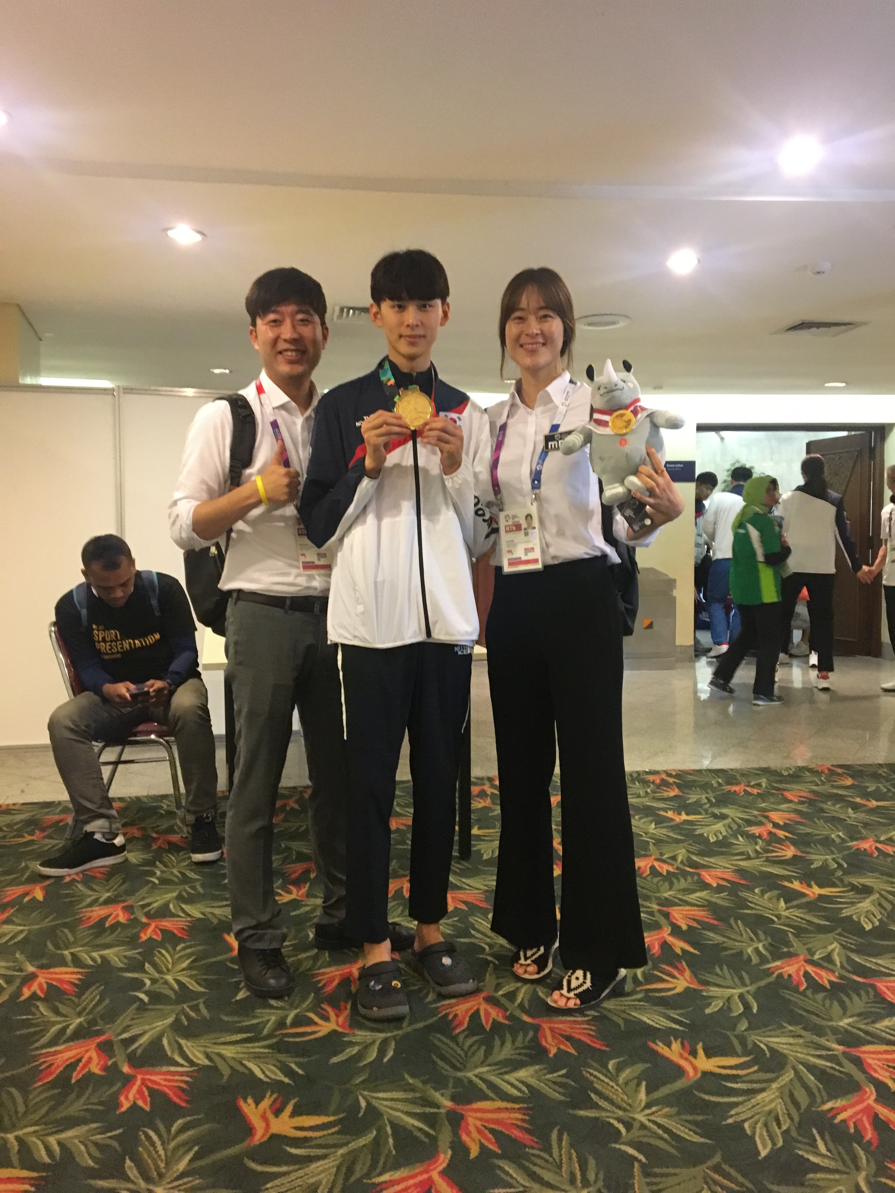 시상식이 끝나고 금메달을 목에 걸고 오혜리 위원, 허일후 캐스터와 다시 만난 김태훈 선수의 한마디 “누나 감사해요.”
