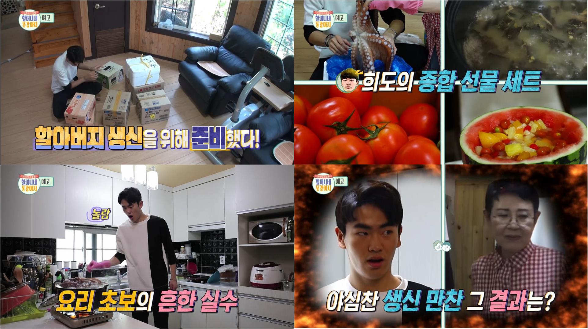 그런가 하면 할아버지 생신상 차리기에 나선 똥강아지도 있다. 주인공은 바로 배우 남능미의 손자 권희도. 제작진이 공개한 사진 속 희도는 할아버지 생신을 앞두고 소주, 토마토 등의 재료를 박스 채 구매하는 통 큰 씀씀이를 자랑했다. 이어 수박을 통째로 화채로 만들고, 거대한 문어를 찜통에 통째로 넣고 삶는 등 남다른 스케일의 요리 준비 모습이 포착돼 궁금증을 유발했는데, 야심 찬 손자의 생신 만찬 준비 결과는 다음 주 본방송에서 공개될 예정이다.