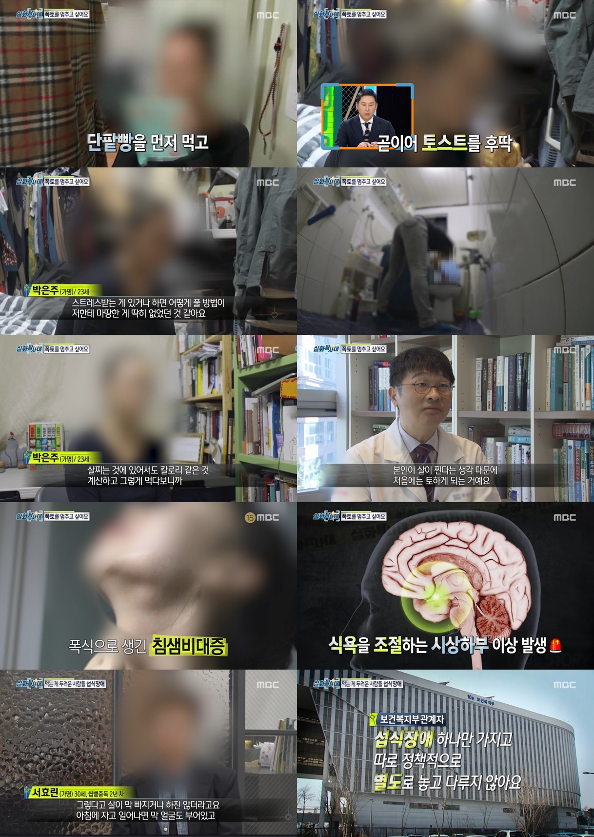 한편, 이 날 방송에서는 '폭토', '씹뱉' 등 섭식장애에 고통 받고 있는 사람들의 이야기에도 주목했다. 웹툰작가인 한 여성은 살찌는 것이 두려워 마음 편하게 먹을 수 있는 방법이 먹고 토하는 것이라 생각, '폭식하고 토하는' 일명 '폭토'를 6년 째 반복하고 있었다. 토하고 나면 다시 배가 고파지고, 소화가 되기 전에 빨리 토하기 위해 급하게 음식을 섭취, 포만감이 생기면 다시 토하는 습관을 반복하다 보니 이제는 음식을 먹으면 토하고 싶다는 강박도 생겼다고 했다. 그녀 뿐만 아니라 한 평범한 직장 여성 또한 다이어트 성공 후 요요를 막기 위해 폭토를 하게 되었다고 했다. 그런데 섭식장애의 증상에는 '폭토' 뿐만이 아니라 최근에는 음식을 씹고 뱉는 '씹뱉'이 유행처럼 퍼지고 있었다.