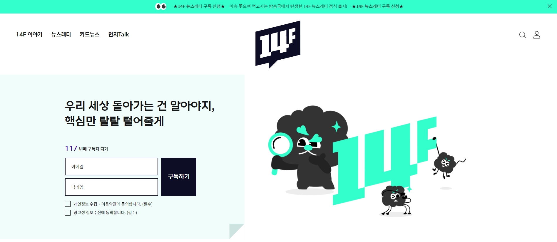 또한 14F 뉴스레터는 기존 다른 뉴스레터 대비 볼거리와 즐길거리가 풍성하다. 텍스트를 기반으로 한 뉴스레터는 경제, 재테크, 이슈, 트렌드, IT, 글로벌, 환경, 스페셜로 분류해 더욱 쉽고 밀도 있게 전달된다. 또한 카드뉴스, 14F 영상 등 이미지와 영상으로 전하는 이슈와 직접 제작한 공식 캐릭터를 활용한 만화 ‘먼지Talk’과 맛집과 문화 및 전시를 소개하는 ‘14F라운지’도 만나볼 수 있다.