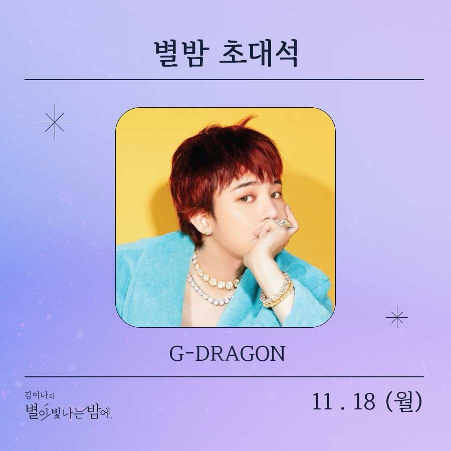 라디오 [김이나의 별이 빛나는 밤에] 지드래곤 12년 만의 라디오 출연! MBC라디오 '김이나의 별이 빛나는 밤에' 오는 18일 출연 |