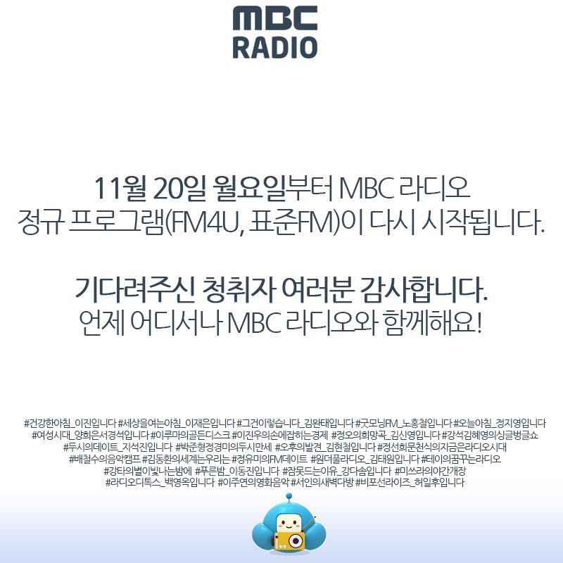 [MBC라디오] 20일(월) 정규 프로그램 방송 재개, 간판DJ 배철수·김신영·테이 “기다려주셔서 감사하다” |